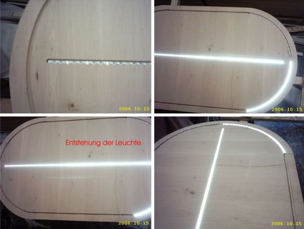Schon während der Renovierung meines Wohnzimmers habe ich mir überlegt was ich für eine Leuchte über den Tisch hänge. Alles Suchen half nix, es gab keine Lampe die mir gefiel. So habe ich mich darangemacht selbst eine Leuchte zubauen. Da ich keine Halogenbeleuchtung haben wollte bin ich auf der Suche nach Altenativen hier hängen geblieben. Um zu testen ob die LEDS meinen Vorstellungen entsprechen hab ich erstmal zum Test zwei SuperFlux-LED Leiste warmweiß bestellt. Da alle Testergebnisse meinen Vorstellungen entsprachen habe dann den Rest bestellt. Die Leuchte der Form des Tisches nachempfunden so das sich die ovale Form ergeben hat. Die Leisten selbst liegen in einer eingefrästen Nut so das sie nicht hervorstehen. Um die Rundung der Leisten zu ermöglichen habe ich eine Lötform gebaut und die Leiste in jeweils 3er Einheiten in die Rundung gelegt. Alle Leiterbahnen habe ich Vorder wie Rückseitig wieder zusammen gelötet. Widerstände die beim Zerscheiden zerstört worden sind habe ich ersetzt. Die Lampe ist durch einen Seilzug in der Decke in der Höhe verstellbar. Die Leistungsaufnahme liegt ca. bei 40Watt.