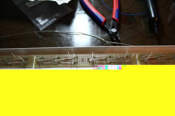 ich hab einfach normale europlatinen in streifen geschnitten, 6x3 leds draufgelötet und dann immer 3 stück in reihe geschaltet. von diesen streifen hab ich 8 stück dann einfach mit 2komponentenkleber in nen kabelkanal geklebt. davor natürlich alle 22,6mm ein 15mm loch gebohrt. angeschlossen hab ich das dann an der widerstandsplatine mit 0,5qmm litze. widerstandswerte waren für rot 240Ω, grün 120Ω und blau 82,5Ω. die widerstandsplatine liegt lose in der mitte vom kabelkanal, 48 kabel halten das schon an ort und stelle. als steuergerät verwende ich chromoflex 2,5A.