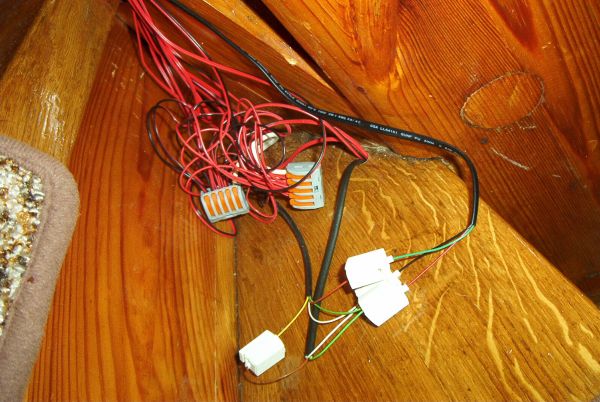 Die nach unten geführten Zuleitungen habe ich dann in einer Abzweigdose an die Stromversorgung sowie den Optokoppler und die Elektronik (Aufenthaltsschalter) im Deckel angeschlossen.