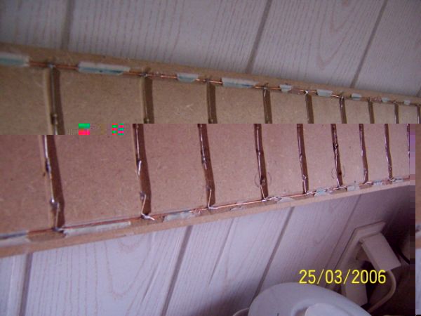 Die zugeschnittenen Bretter ausm Baumarkt hab ich dann Rückseitig (die Seite die dann mal direkt am Schrank anliegt) mit der Oberfräse mit Nuten versehen, um darin die Kupferleitungen (ist in meinem Fall 1mm² Kupfer, für max 2A also kein Problem) zu verlegen. Für jede LED eine Quernut von der einen zur anderen Seite (aber vorher genau vermessen nicht vergessen, soll ja gleichmässig aussehen) gefrässt, die Löscher (bei 3 mm Led ~5,5 mm) zum Durchstecken der Leds bebohrt und die + und - Leitung für die Parallelschaltung noch in die Nuten geklebt (mit Acryl hab ichs gemacht) und erstmal Feierabend gemacht.