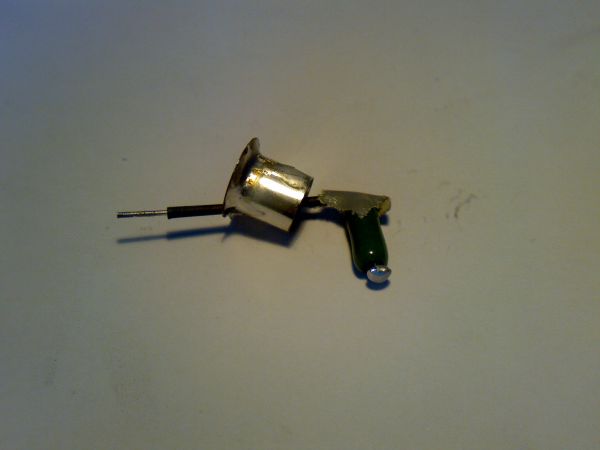 Um den Anodenanschluss durchzuführen dremelt ihr ein Dreieck in die obere ecke des Sockels. Den Widerstand an einer Seite mit Schrumpfschlauch isolieren und ein Stück Gewebeklebeband über den Knick kleben. Die Andere Seite kürzen, umbiegen und aus Lötzinn einen Klecks formen. Diese dient nachher als Kontakt zum Pluspol der Batterien.