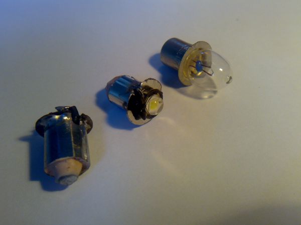 Da man für die erste Version eine MagLite Birne opfern musste, habe ich mir was anderes überlegt. Die Birne in dieser Anleitung dient nur der Größenorientierung. Ein weiterer Vorteil ist, dass hier nicht an der Maglite an sich verändert werden muss. So kann man diese umgehend wieder auf Glühbirnenbetrieb umstecken.