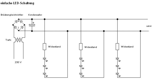 Diese beiden Leitungen unterbrichst du dann alle 3 LEDs und setzt die Reihenschaltung ein.