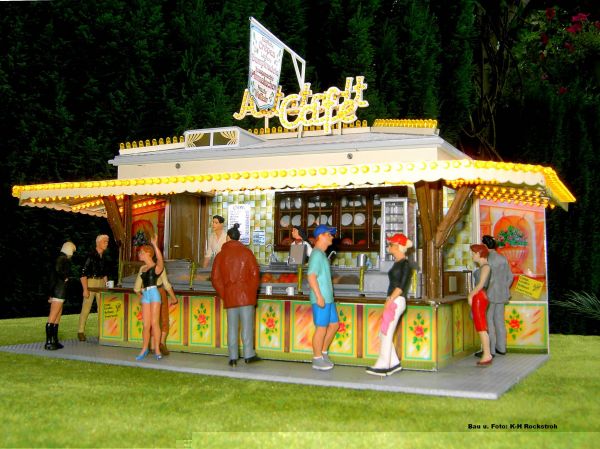 Bierkrüge aus 4mm Messingrohr daran wird ein kleiner Henkel gelötet,auf länge schneiden fertig ein Bierkrug. Fritüren aus 0,5 mm rechteck Messingprofilen klein geschnitten lackiert fertig. Eimer und Schüsseln aus Dosenblech geformt Ränder aus 0.5 mm Messingprofile angelötet fertig. Süsswaren aus bunten Perlen 0,3mm Draht mit Sekundenkleber einlöten farblich gestalten fertig. Modelle werden nur aus Messingprofilen, Zinkblech und Epoxydplatinen kupferbeschichtet gebaut Du siehst also kein Geheimnis mein Modellbau.