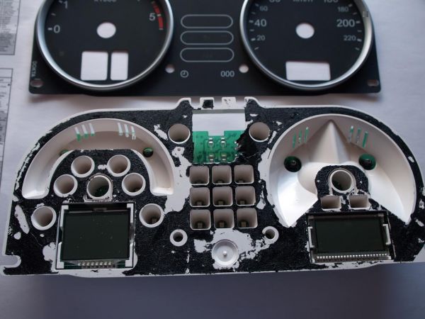 Nun noch die beiden Platinen mit der Hauptplatine verkabelt ein erster kleiner Test Hier die Tachofolie mal draufgelegt So und ab hier folgen aus Qualitätsgründen die Bilder mit der DSLR Hier die invertierten Displays eingebaut und im Auto getestet Im vergleich dazu wie er vorher ausgesehen hat: Jetzt muss dann noch das Gehäuse wieder zusammengebaut werden und der Tacho ist wieder komplett!