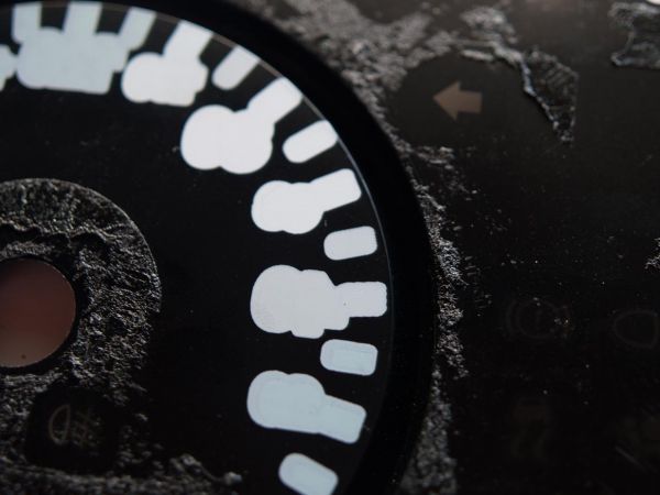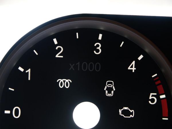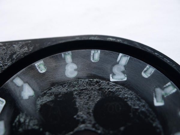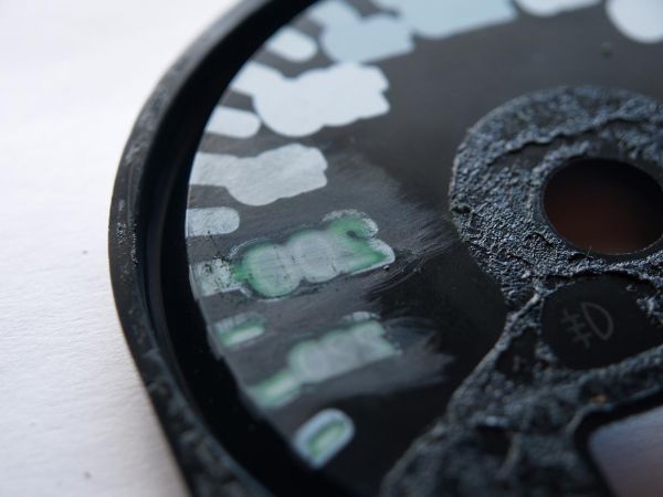 Also gehen wir nun davon aus, dass der Tacho ausgebaut ist, der Tacho zerlegt und die Tachofolie herunten ist. Somit ist nun schnell klar warum das ganze so hässlich grün leuchtet. Das ist die Tachofolie von hinten. Wie man sehen kann, ist sie im Bereich der Zahlen mit einem durchscheinenden Lack überzogen. Dazu aber später mehr... Hier kann man sehen, wie es vor der Behandlung ausgesehen hat und so nachher: der Drehzahlmesser schon komplett vom grün befreit Diese weiße Schicht wurde mit einem recht scharfen Messer und feinem Schleifpapier langsam abgetragen