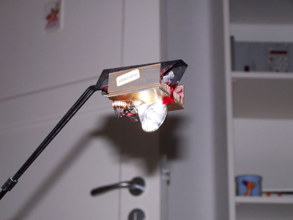 Als LED kam eine Luxeon K2 zum Einsatz, ein Spannungswandler (LT3474) wandelt das ganze bequem und effizient. 800 mA reichten nach einigen Leseproben vollkommen aus. Die auf 4° Halbwinkel bündelnde Linse (sponsored by Carclo Optics) bringt auch in 2 m Entfernung genug Licht.