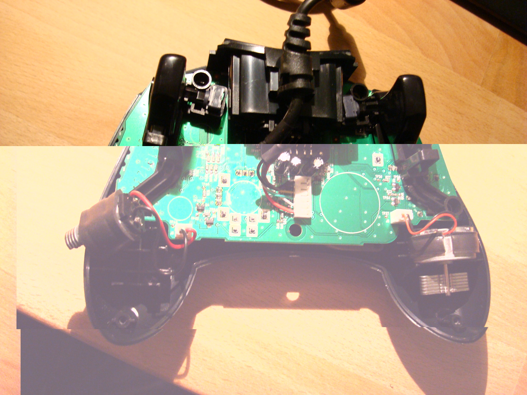 Also hab ich den Contoller erst einmal aufgeschraubt: und an den linken Drehmotor (der die Vibrationen im Controller hervorruft) eine weiße und eine blaue LED -und passende widerstände- gelötet.