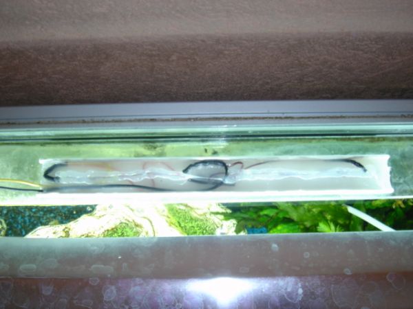 Ich habe einfach eine blaue SMD-Leiste genommen. Diese habe ich mit einem Netzteil verlötet, wobei das Netzteil in der Spannung zwischen 3V und 12V einstellbar ist. Die Leiste habe ich dann mit zwei Tropfen Silikon am Aquariendeckel befestigt und trocknen lassen.