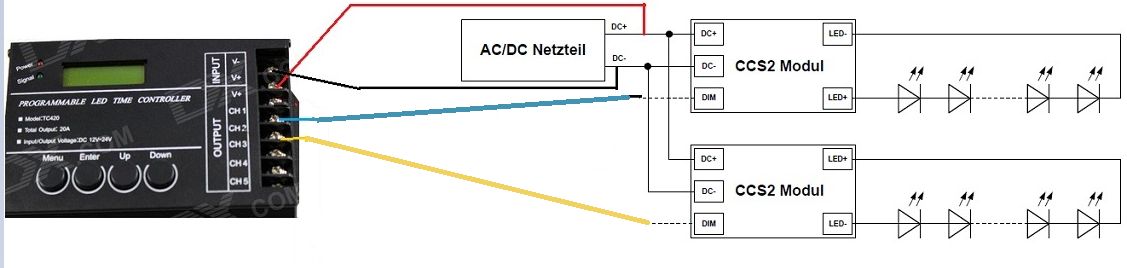 Das Netzteil vom Cree mit minus an dem TC420, Dim an Kanal 5 ?