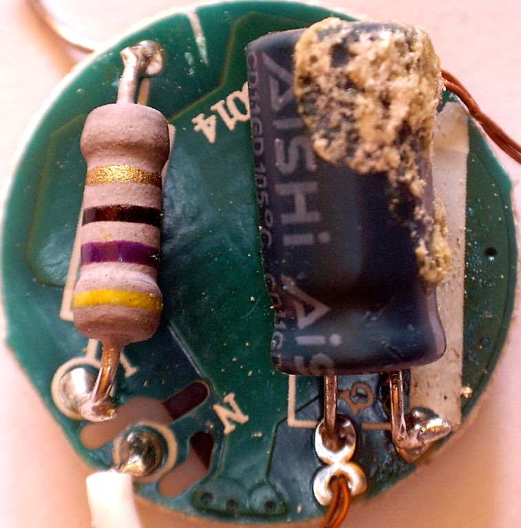 Zum Vorschein kam eine winzige ringförmige Platine mit einem Kondensatornetzteil (SMD-Gleichrichter und SMD-Keramikkondensator). Leider saß die Platine auf einem Glasröhrchen, was wohl zum Befüllen und Versiegeln des Kolbens diente. Da sich der Sockel bei Abpellen leicht verkantet hat, ist dies Röhrchen gebrochen. Ich habe es nach ein paar Minuten mit Epoxy abgedichtet, aber in der Zeit kann sich schon etwas Luft mit dem Füllgas vermischt haben. Für zukünftige Umbauten werde ich wohl erst den Draht am zentralen Kontakt mittels Lötpumpe ablöten.