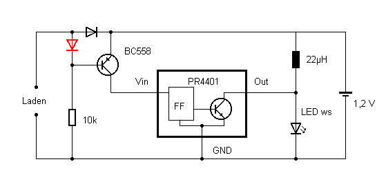Ich habe die Schaltung aufgebaut und tatsächlich, die LED leuchtet. Als ich dann aber eine Solarzelle an den "Laden"-Eingang angeschlossen habe, brannte die LED weiter. Der Fehler liegt in einer verdrehten Diode. Hier muß die Sperrichtung geändert werden, dann funzt die Abschaltung der LED :D :D :D