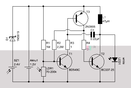 Bei der Schaltung mit den 3 Transistoren kommt die gleiche LED zur Verwendung wie bei o.g. Schaltung. Hier ergibt sich ein Stromfluß von ca. 20mA. Wichtig ist, dass die Schaltung auf eine Eingangsspannung von 1,2V optimiert ist. Ist die Eingangsspannung >1,2V (z.B. Akku frisch aus dem Ladegerät) wird die LED dunkler, da der Spannungwandler nicht optimal arbeitet. Also bitte erst prüfen ob der Akku 1,2 Volt.