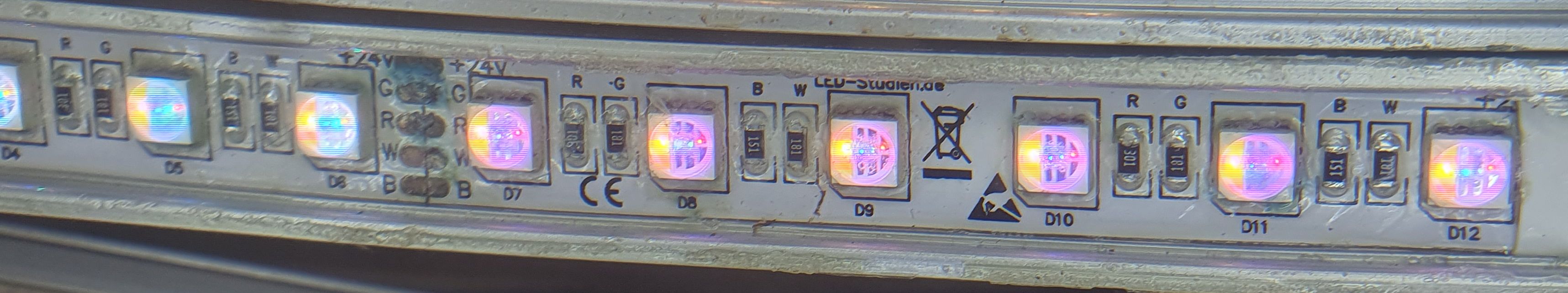 Was mir auch nicht gefällt, ist der Übergang von LED-Streifen zu Aluprofil. Dieser Übergang, also die Kante, muss auf jeden Fall mit dem Lack wasserdicht versiegelt werden. Wenn Wasser unter den Streifen gelangt (Stichwort Kapillareffekt) kann es auch dort zur Korrosion kommen. Danach sieht es bei dem RGBW-Muster aus. Wasser auf stromdurchflossenen Kupfer- oder Zinnflächen bewirkt sehr schnell eine starke Korrosion. Wenige mA sind da völlig ausreichend.