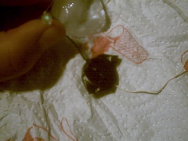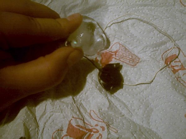 So dann habe ich den einen + Kontag, unter dem Eiswürfel versteckt, der direkt mit der Batterie angeschlossen ist, und den anderen habe ich dann oben drauf gehalten, und siehe da die Led leuchtet ganz wenig, aber sie leuchtet.