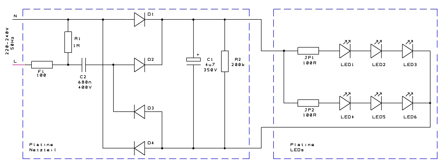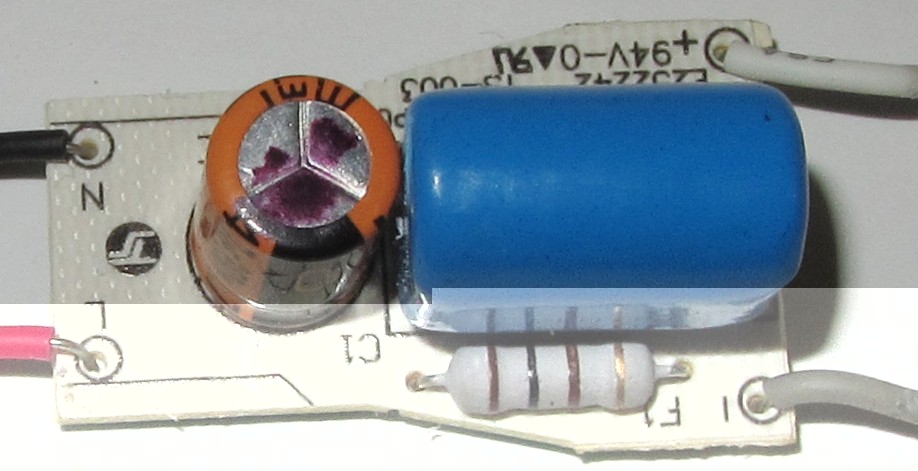 Durch die hohe Betriebsspannung der LED-Platine werden die Nachteile eines Kondensatornetzteils zumindest zum Teil wieder wettgemacht. Trotzdem muss man bei diesen Strahlern mit einer Blindleistung von ca. 6,7 W leben. Bei normaler Anwendung im Wohnbereich sollte das aber nicht stören.