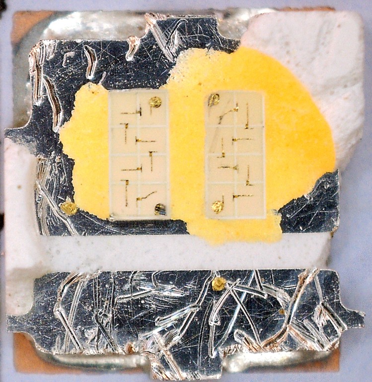 Die LED enthält 2 Chips, die jeder für sich anscheinend aus je 6 LEDs besteht. Es sind wohl 12 Einzel-LEDs in Reihe geschaltet. (Die Bondingdrähte sind nach dieser brutalen Behandlung natürlich nicht mehr vorhanden.)