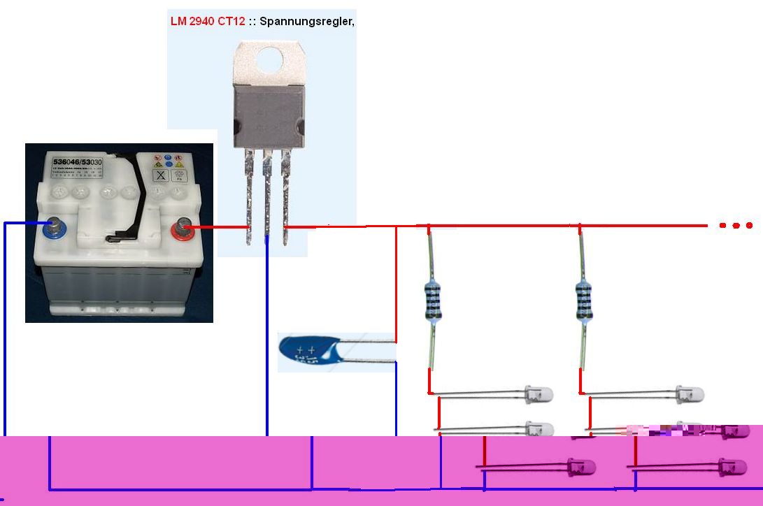 Zu beachten ist lediglich, daß ca. 3V für diese Schaltung mit eingeplant werden müssen, an knappen* 12V also z.B. noch 2 weiße oder blaue LEDs angeschlossen werden können!