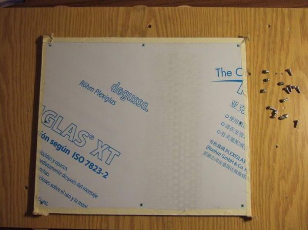 Als allererstes habe ich alle drei Plexiglasscheiben aufeinander gelegt und mit Klebeband fixiert. Danach auf dem Seitenteil ausgerichtet und mit etwas Klebeband Nun habe ich die Löcher angezeichnet. Dann das ganze wieder vom Seitenteil gelöst und die Löcher gebohrt.