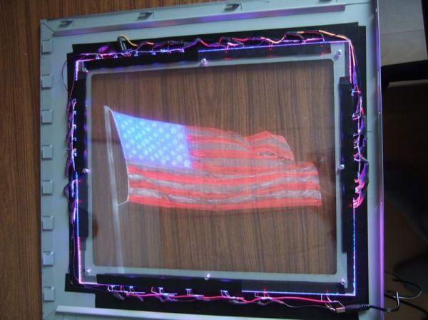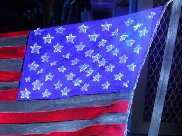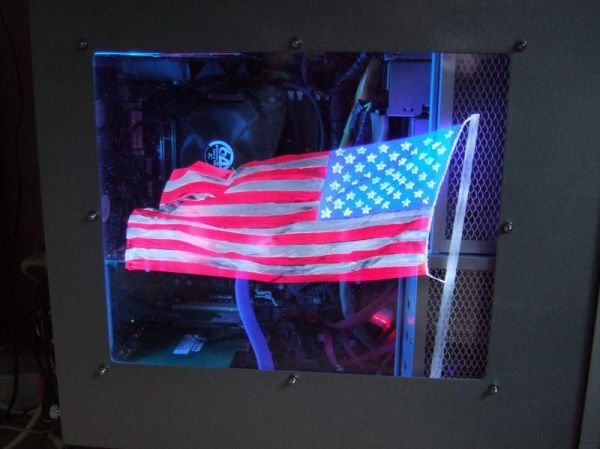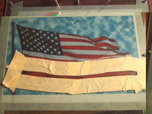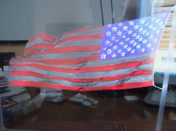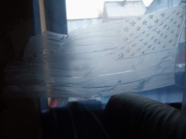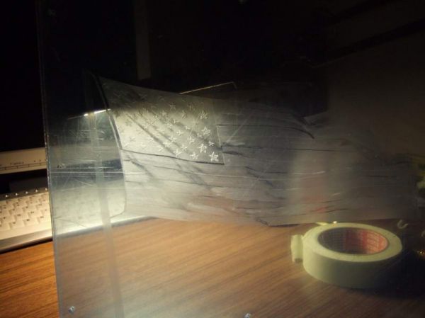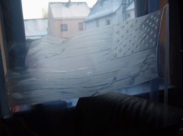 Als Logo hab ich mir die USA Flagge ausgewählt. Es soll später so ausschauen als würde sie im Wind wehen. Zunächst einmal habe ich die Vorlage von unten gegen das Plexi kleben. Ich habe die Schrauben zur Sicherheit wieder montiert, so vermeide ich Kratzer an der Unterseite. So nun das ganze Sauber abkleben und los geht's: