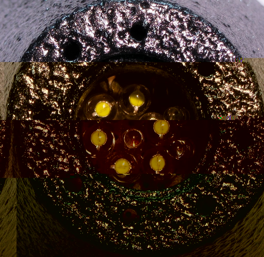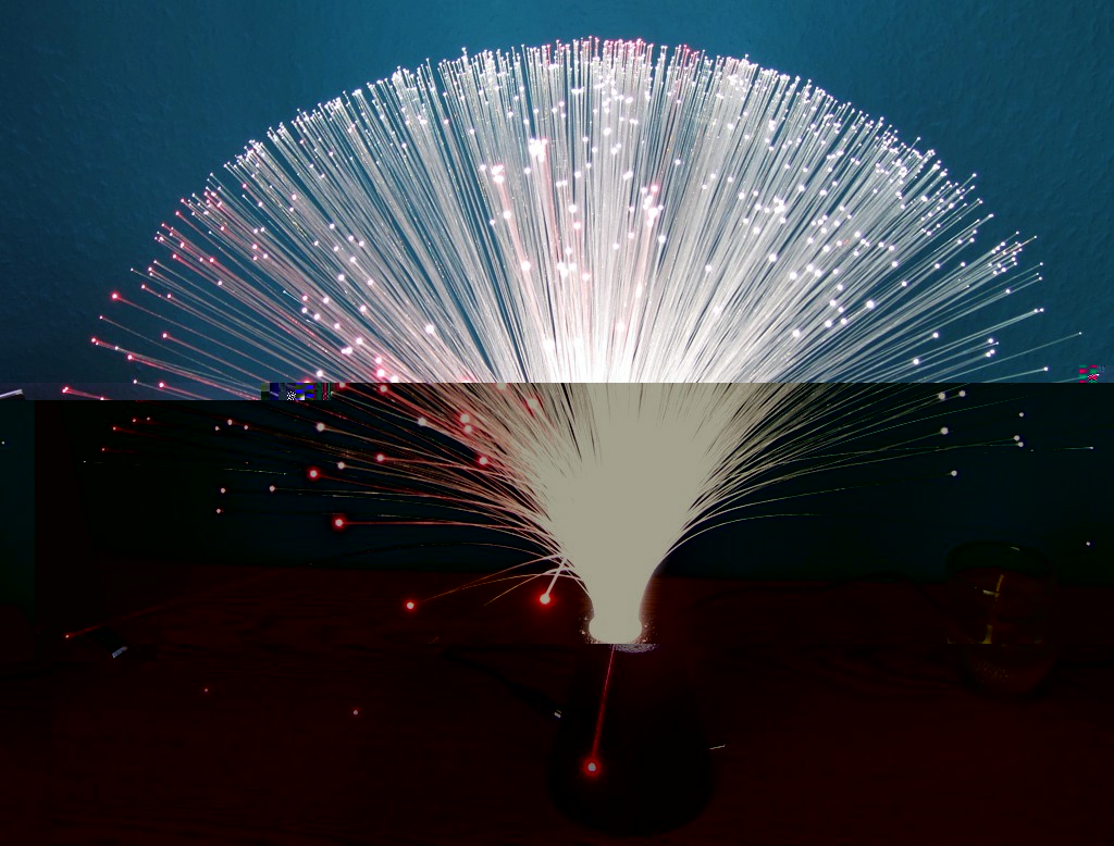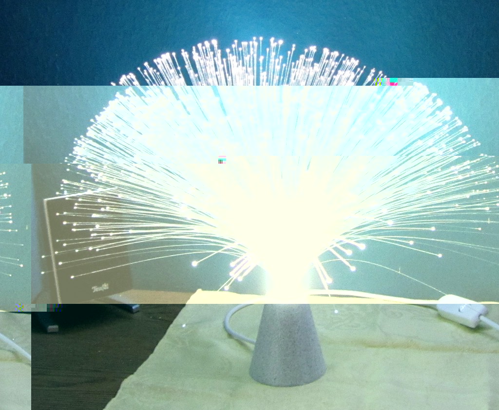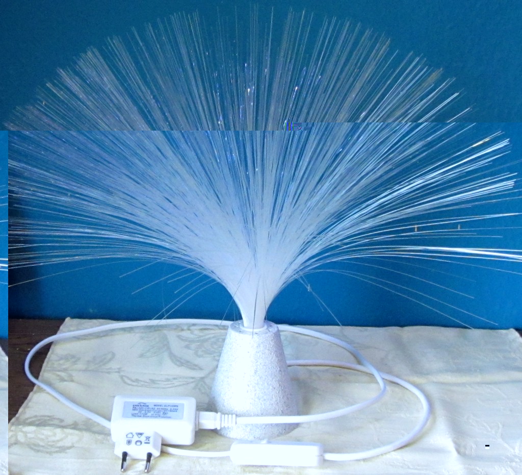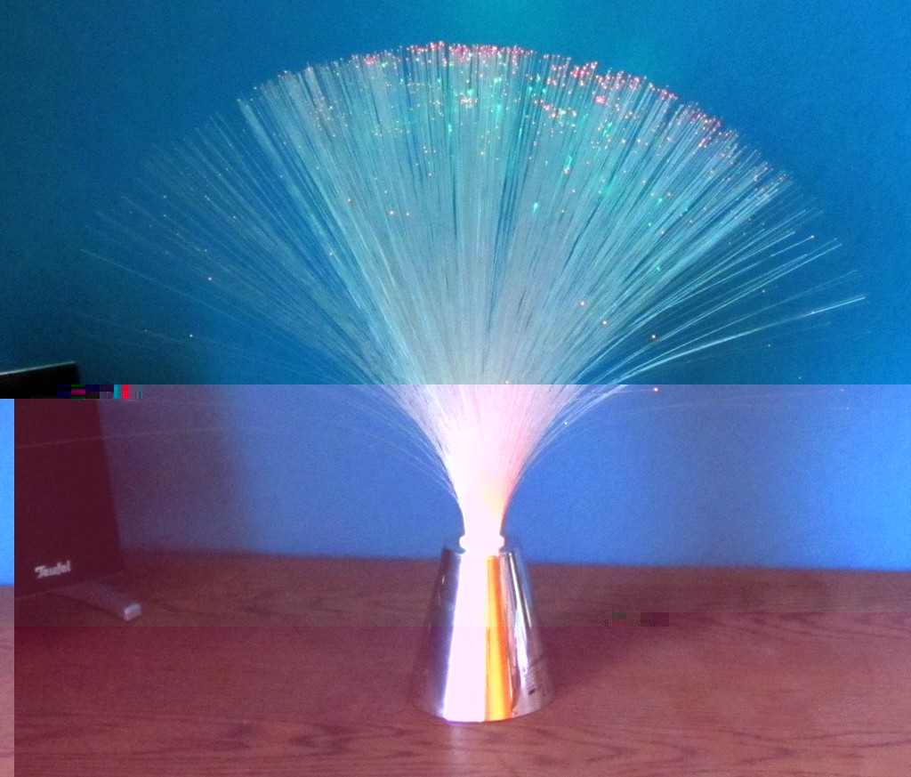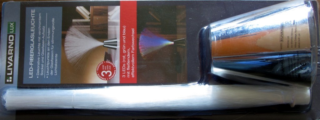 Wie man sieht, ist der Effekt nich gerade berauschend. Das Fiberglasbündel ist zu keinem Zeitpunkt vollständig ausgeleuchtet, über die Lichtstärke braucht man gar nicht zu reden und außerdem wird das Ganze auch noch mit Batterien betrieben. Also: auf der Unterseite zwei Schrauben lösen, dann kann man das ganze Innenleben entsorgen.