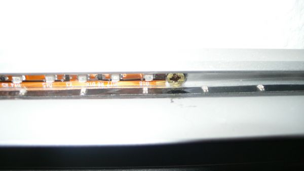 des hintere (braun) ist die leiste mit den Roten un des vordere, was auf dem Boden klebt und schwarz ist, ist die leiste für die blauen LEDs. ich habe erst die leisten in ihre kleinesten Enheiten eingeteilt, dann mit Litzen verlötet und dann einfach mit Tesafilm eingeklebt.