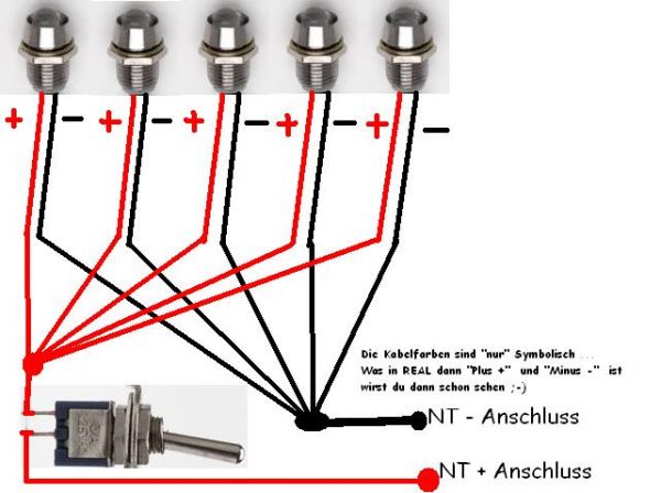 Gehen wir davon aus ich habe 5 LED Schrauben in rot mit Widerständen (die schrauben ausm shop),