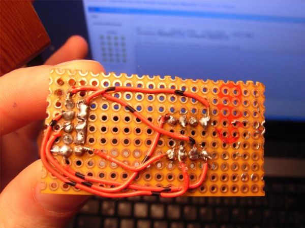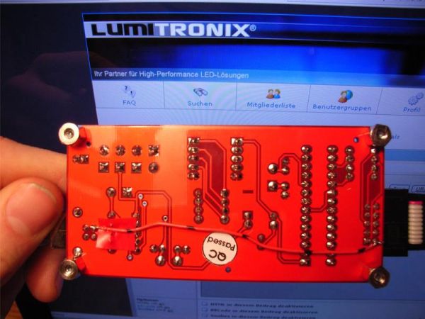 großes Bild Ist übrigens mit der Laserdrucker-Bügelmethode aufgezeichnet auf die Platine und dann wie üblich geätzt.