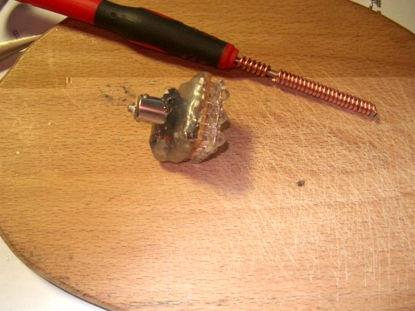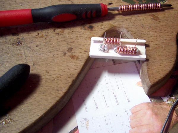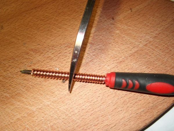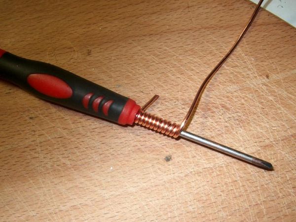 Dazu habe ich den abisolierten Kupferdraht auf einen kleinen Schraubendreher zu einer Spirale gewickelt (für größere Teile benutze ich den Draht aus den Reinigungs-Kleiderbügeln zum Aufrollen des Kupferdrahtes)