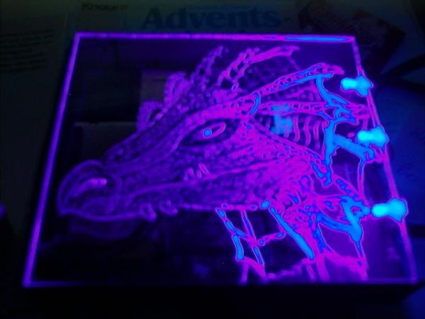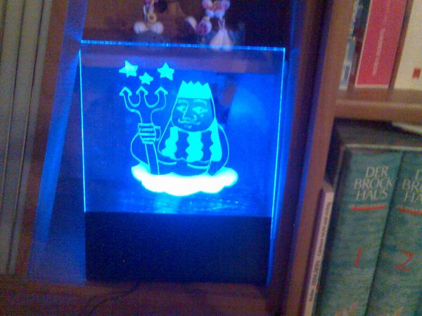 Hier noch mein Lieblingsbild,eine Gravur auf Glass Mit roten LED`s beleuchtet.[