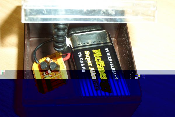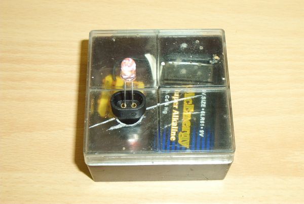 Hier einmal die Seitenansicht, in der oberen Hälfte die kleine Platine mit den zwei Widerständen und den beiden Transistoren (siehe Schaltplan)im unteren Bereich das BLaue sind drei Knopfbatterien in Reihe geschaten und mit Isolierband versehen