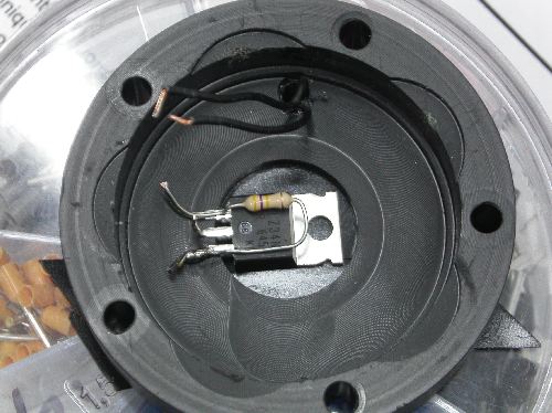 Der Lampenkopf hat einen Innendurchmesser von 50,8mm. Ich habe mir eine Cu-Scheibe mit 50,65mm Durchmesser und 8mm Dicke drehen lassen. (Diese Dicke war gerade übrig). In die Scheibe habe ich in die Mitte ein Loch für das Hohlsteckergewinde gebohrt und etwas weiter am Rand zwei gegenüberliegende Löcher für M3-Schrauben. Die äußeren Löcher dienen nur dem besseren Handling beim Einsetzen und Herausnehmen der Cu-Scheibe aus dem Lampenkopf. Dann habe ich die Linsen in die Linsenhalter gesetzt, die mit etwas Epoxydharz fixiert und nach dem Aushärten die Haltenasen entfernt. Dann liegen die Linsen auch schön plan am Lampenglas an. Die Linsenhalter musste ich mit dem Dremel noch an den Ecken etwas abschleifen, da beim Einsetzen der vierten Linse mit Halter der Platz alle war. Es fehlte aber nur ca. 1mm. Dann die Linsen mit Halter so einsetzen, dass eine der Aussparungen an der Unterseite des Halters zur Mitte zeigt und mit den P4 bestücken. Jetzt jeden P4-Boden dünn mit Wärmeleitkleber bestreichen und die Cu-Scheibe einsetzen. Dabei etwas Druck ausüben und die Cu-Scheibe ganz leicht hin und her bewegen. So hat man eine dünne gleichmäßige Schicht zwischen der P4-Platine und dem Kühlkörper. Nach dem Aushärten des WLK habe ich dann die SMD-Widerstände angelötet. Und zwar jeweils zwei 0,22Ω / 1Watt am +-Anschluss der P4 parallel, so dass sie in die Mitte der Cu-Scheibe zeigen. Dann wird von der Unterseite der Hohlstecker eingeschraubt und mit den LED’s verbunden.