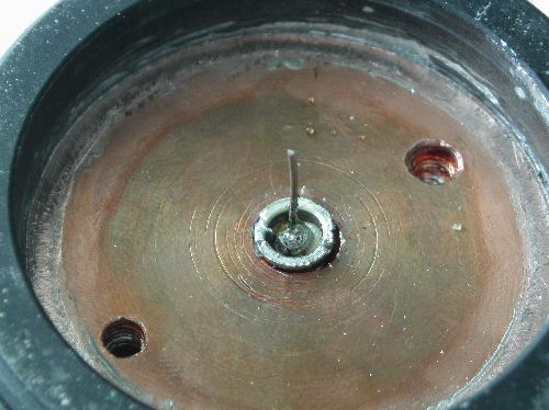 Dazu habe ich den Kern des bereits eingebauten Hohlsteckers in der Bohrung gelassen und die Mitte mit Lötzinn ausgegossen. Danach wurde in der Mitte ein Stück Draht (Anschlussbeinchen von einem Widerstand oder ähnliches) eingelötet... … und ein Stück Leiterplatte aufgebracht. Am günstigsten ist Leiterplattenmaterial, bei dem keine Leiterbahnen vorgegeben sind. Anderes geht aber zur Not auch. Die Leiterplatte wurde auf der Unterseite mit Epoxydharz auf die Cu-Scheibe geklebt. Nach dem Aushärten des Harzes wird das Stück Leiterplatte dick verzinnt. Anschließend mit einem Kugelkopffräser vom Dremel das Zinn so bearbeiten, dass die Oberfläche zur Mitte hin abfällt, also eine Vertiefung hat. Dies verhindert später beim Zusammenschrauben der Lampe das wegrutschen des Pluspols. Jetzt muss noch das Lampengehäuse mit Kontakten versorgt werden. Ich habe die Hohlbuchse in der Mitte wieder entfernt und durch eine andere Konstruktion ersetzt.