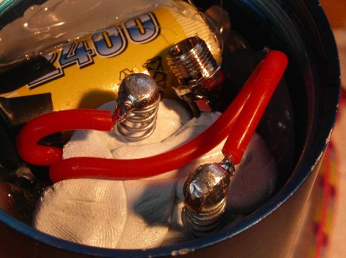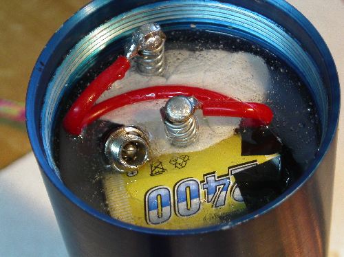 Nachdem ich den Platz zwischen Lampenkopfboden und Gehäuse ermittelt habe wurden zwei Druckfedern unter Zugabe von ca. drei bis vier Millimeter gekürzt und im Gehäuse fixiert. Dazu habe ich etwas „Pattex-Power-Knete“ benutzt. (Das ist eine Knete auf der Basis von 2-Komponenten-Epoxydharz, lässt sich sehr gut verarbeiten, tropft nicht, wird steinhart und härtet schnell aus.) Dann noch die Stromzufuhr angeschlossen (+ = Mitte)… ….und noch etwas Epoxydharz aufbringen. Fertig.