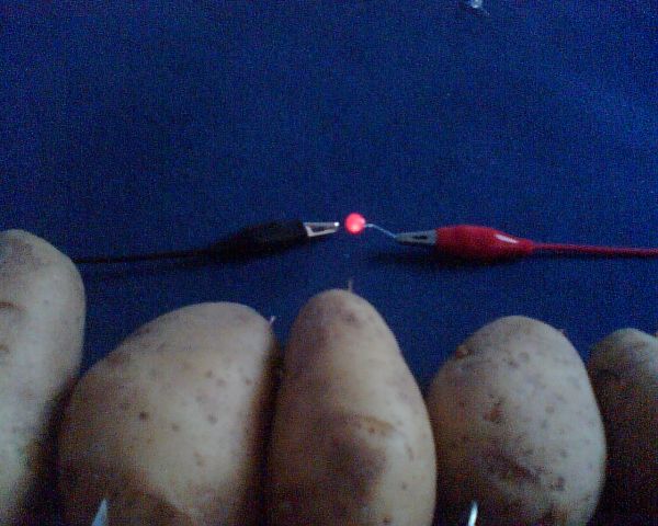 hier mal mein kartoffel reaktor man braucht nur ein paar kartoffeln etwas kupfer und alublech(es muss immer ein edles und unedles metall sein ich hatte grad nur das da), dieses blech in streifen schneiden und in die kartoffeln zu stecken mit kabeln verbinen(reihenschaltung) und in meinem falle eine rote diffus led dran hängen und siehe da sie leuchtet!