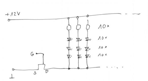 2. Jetzt kannst Du die Helligkeit über einen MosFet, der an die PWM direkt angeschlossen wird regeln.