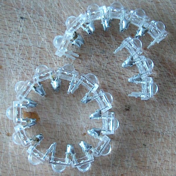 Und das Ganze von oben. Deutlich zu erkennen der Versatz der beiden Ringe und die Anschlussbeinchen (es sind immer noch 3er-Reihen, von denen jede einen eigenen Vorwiderstand zum Abgleich bekommt):