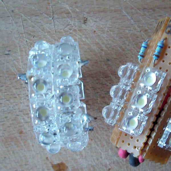 Dazu habe ich 18 Hyperhelle LED weiß 11000mcd 20° 5mm 3.1V in eine milchig-durchsichtige Filmdose gebaut. Die LED´s sind nach unten gerichtet, strahlen aber die Dose an. (Das Ding ist im Moment mit einem Freund unterwegs, wenn es zurück ist, mache ich Bilder.)