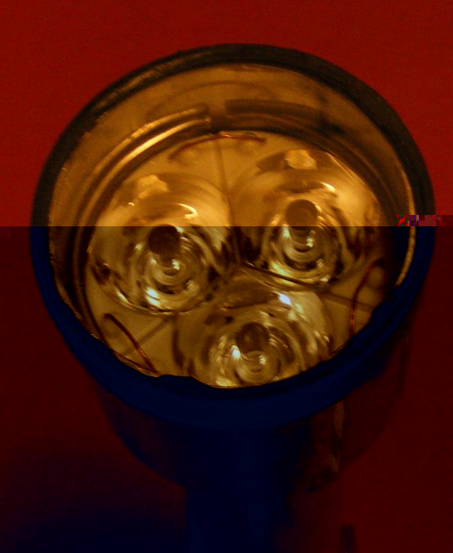 Unterseite: Innenleben vor dem Einbau: Leds: Und Linse: Die Linse ist nur gesteckt, aber mit einem Stahlring gesichert. Um notfalls die Linse wieder rauszukriegen, sind die kleinen Kupferdrahtringe zwischen den Einzellinsen befestigt. Als Schutz (vor Regen, Dreck...) ist noch eine Glasscheibe (aus einer alten Taschenlampe) davor gesetzt und mit Sailors selbst verschweißendem 'Klebeband' befestigt.