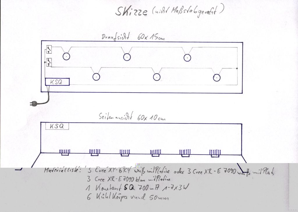 wiederum danke für die Antworten. Hier also nochmal die veränderte Zeichnung. Bitte prüft nochmal die Schaltung (ob das jetzt richtig in Reihe geschaltet ist) und die Materialliste (insbesondere die KSQ) ob ich das so bestellen kann. Ich würde dann zur Tat schreiten :D
