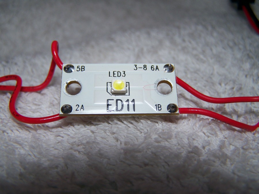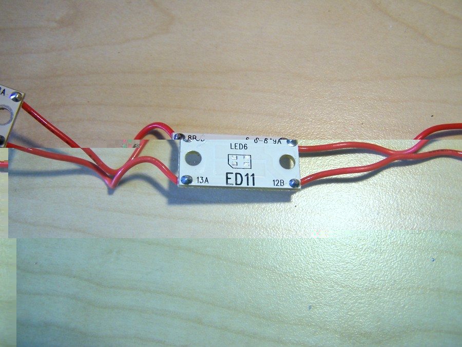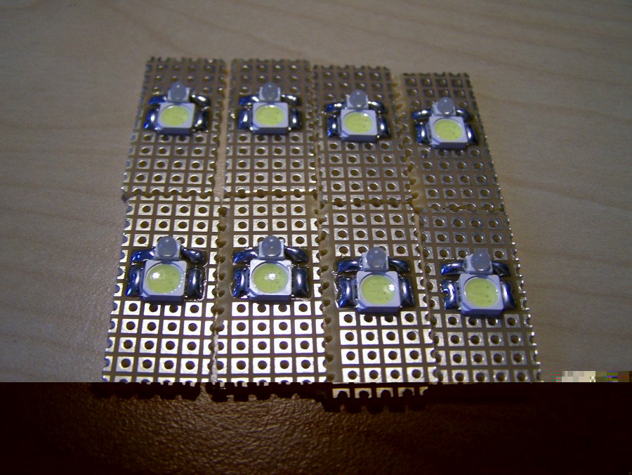 2. je 4 Platinen neu angefertigt und mit weißer Samsung-Led und orangener Osram-Power-Topled ausgestattet und von hinten mit Drähten versehen