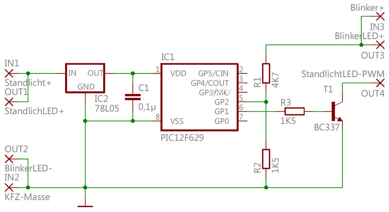 Damit die Blinker nicht im sehr hellen weißen Samsung Licht untergehen, habe ich noch eine Dimmerschaltung gebaut, die die Samsung abdimmt, sobald ein Blinkersignal da ist. Es ist ein kleiner Pic Mikrocontroller von Microchip mit Schalttranistor. Anbei die Schaltung und das Layout.