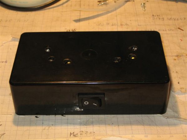 Zuerst haben wir das Gehäuse bearbeitet. Also erstmal 6 Löcher gebohrt, entsprechend der gewünschten Standposition der Figuren die dann draufsollten. Die Löcher sind alle schräg angesetzt, so dass die LEDs, die dann in die Löcher kommen, immer in den Mittelpunkt der Figur strahlen. In die hintere Seite des Gehäuses wurde ein Loch gebohrt und weiter ausgefeilt, in das wir dann den Schalter clipsten. Nun standen wir vor dem Problem der LED-Befestigung: Einfach Heißkleber bündig einzufüllen und die LEDs damit zu befestigen führte zu nichts, da der Kleber beim Aushärten diffus wird, und somit der Kristall-Effekt geschwächt wird. Deshalb griffen wir zu ganz simplen LED-Fassungen, die mit einem Tropfen Heißkleber erst (schräg) fixiert wurden, und dann für mehr Stabilität solide umklebt wurden. Bei diesem Stadium kam uns dann erst die Idee, mal ein paar Fotos zu machen